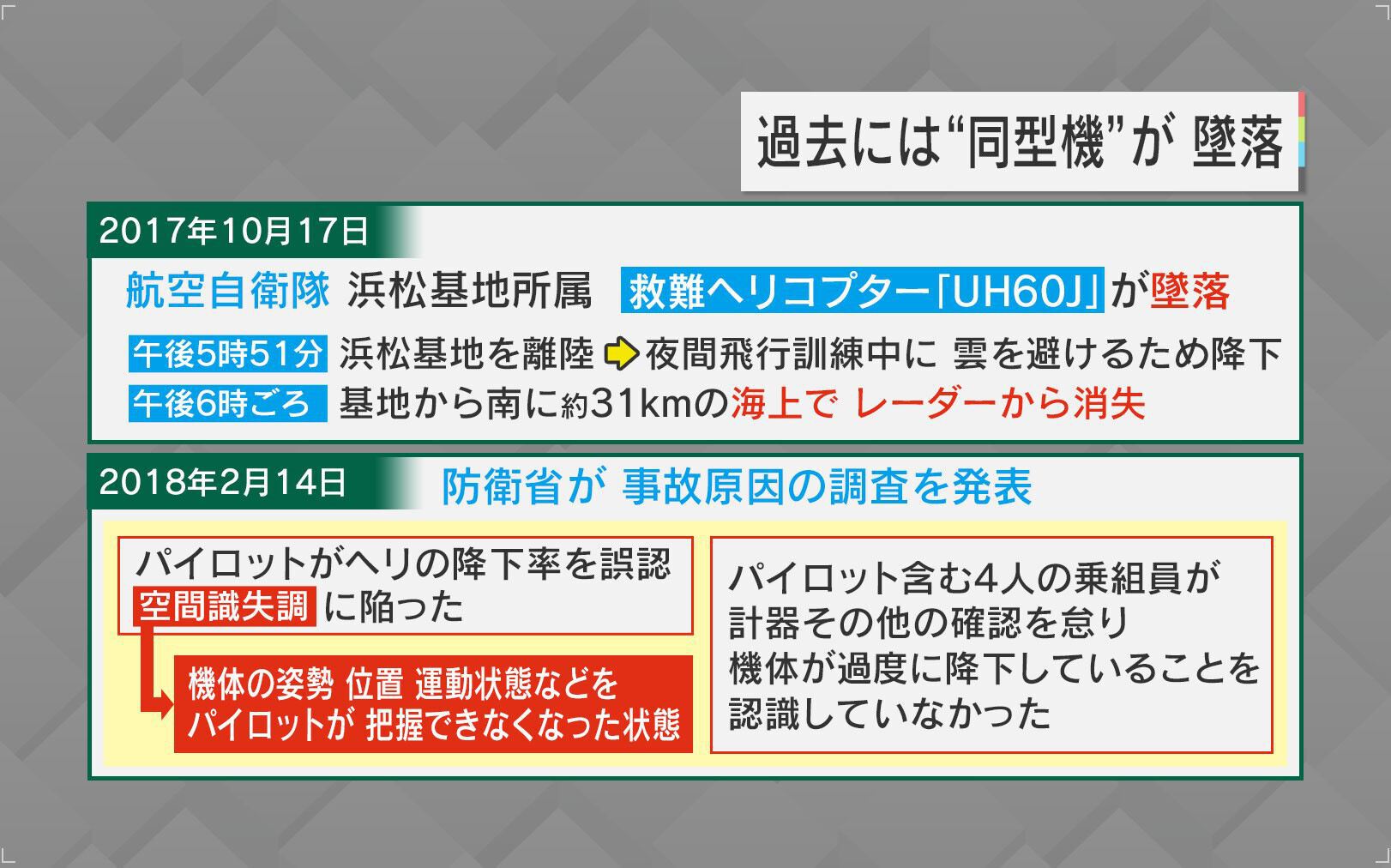 過去には同型機の墜落事故が発生しています。2017年に航空自衛隊の浜松基地に所属するヘリコプター「UH60J」は離陸後、約10分でレーダーから消失しました。この原因として、防衛省は「パイロットがヘリの降下率を誤認、“空間識失調”に陥った」と発表しています。この“空間識失調”とは、機体の姿勢・位置・運動状態などをパイロットが把握できなくなった状態で、健康な人でもなるということです。