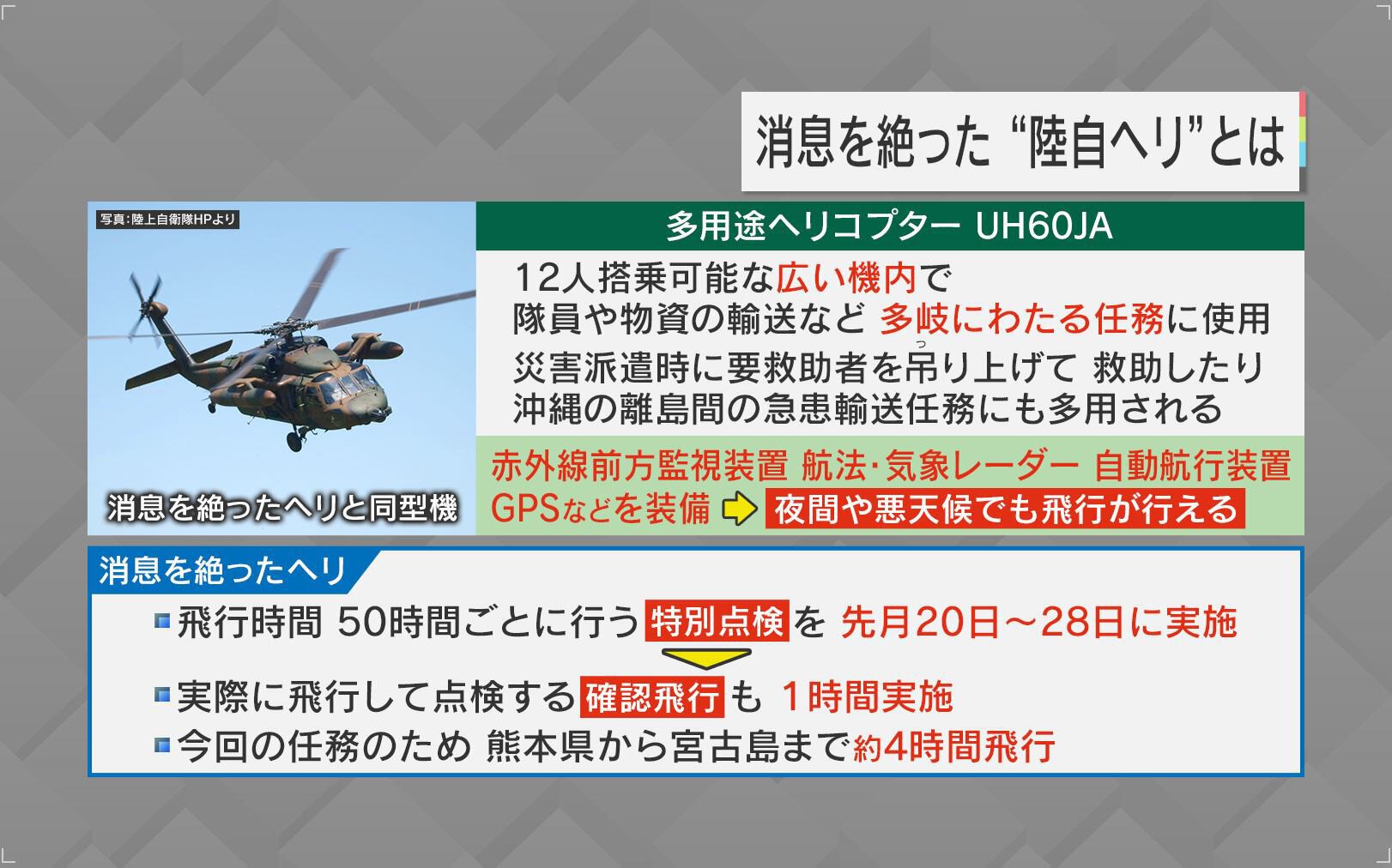 消息を絶った機体は、多用途ヘリコプターUH60JAです。12名搭乗可能な広い機内で、隊員や物資の輸送など、多岐にわたる任務に使用されています。夜間や悪天候でも飛行でき、災害派遣時にも使われているというものです。