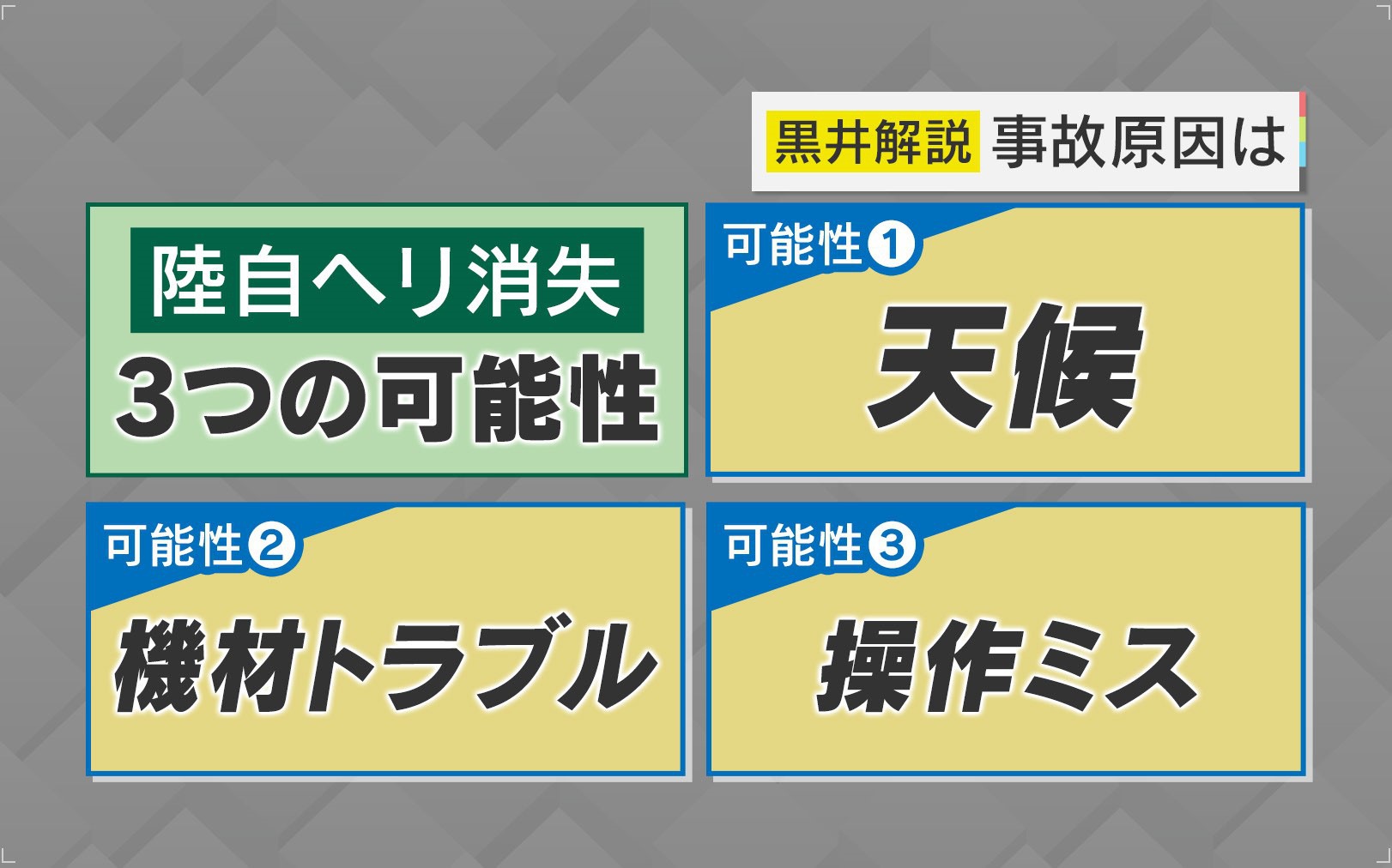 黒井氏は、2つめの考えられる原因として「機材トラブル」を挙げています。消息を絶ったヘリは、飛行時間50時間ごとに行う特別点検を、3月20日~28日に実施していて、問題がありませんでした。また、実際に飛行して点検する確認飛行も1時間実施し、今回の任務のために、熊本県から宮古島まで約4時間飛行していて、その時点でも問題はなかったということです。