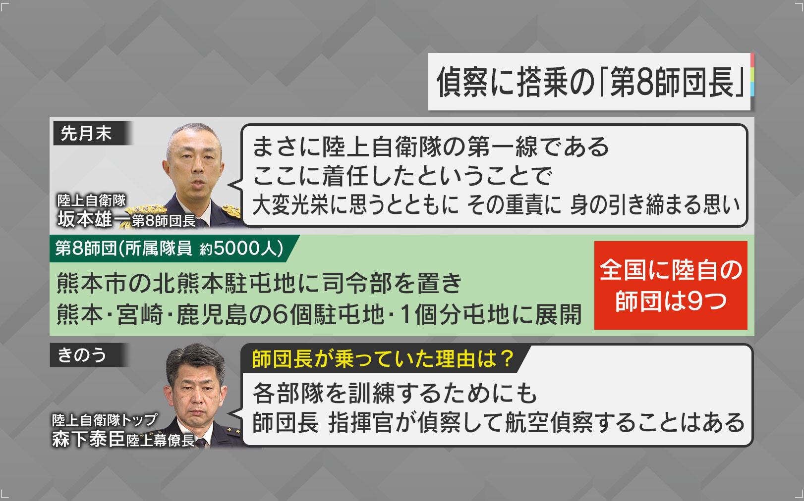 師団長が航空偵察訓練のヘリに乗っていた理由について、陸上自衛隊トップ・森下泰臣陸上幕僚長は「各部隊を訓練するためにも師団長・指揮官が偵察して航空偵察することはある」としています。