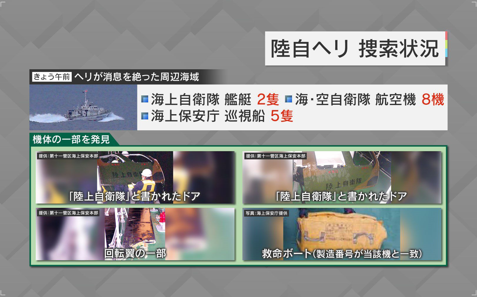 7日午前までに、「陸上自衛隊」と書かれたヘリのものと思われるドアや回転翼の一部・救命ボートなどが見つかっています。