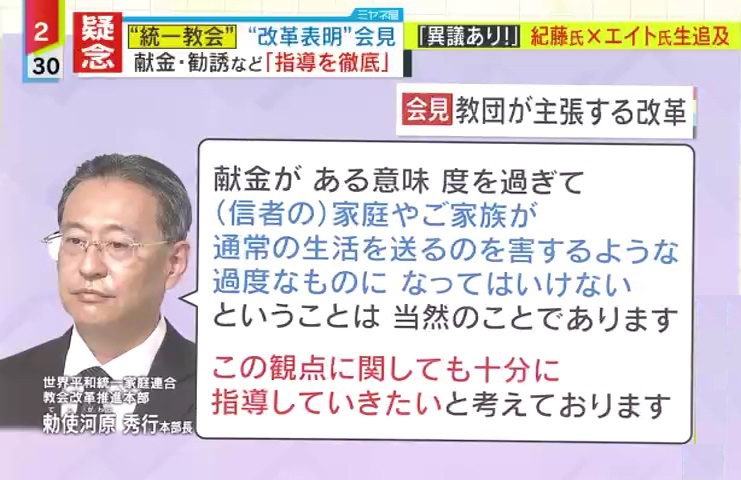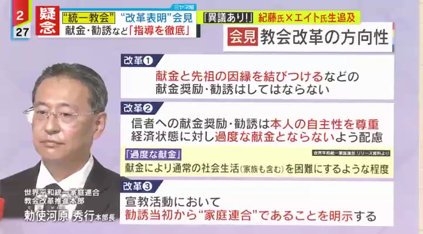 会見ではその後、勅使河原氏から改革の方針について、2009年のコンプライアンス宣言時からの指導である「①民事裁判等で問題とされた、献金と先祖の因縁等を結びつける、または、威迫・困惑を伴うような献金奨励・勧誘行為はしてはならない。②信者への献金の奨励・勧誘行為は、あくまでも信者本人の信仰に基づく自主性及び自由意思を尊重し、信者の経済状態に比して過度な献金とならないよう、十分配慮しなければならない。③伝道活動において、勧誘の当初から“家庭連合”であることを明示すること」を再度徹底すると説明がありました。