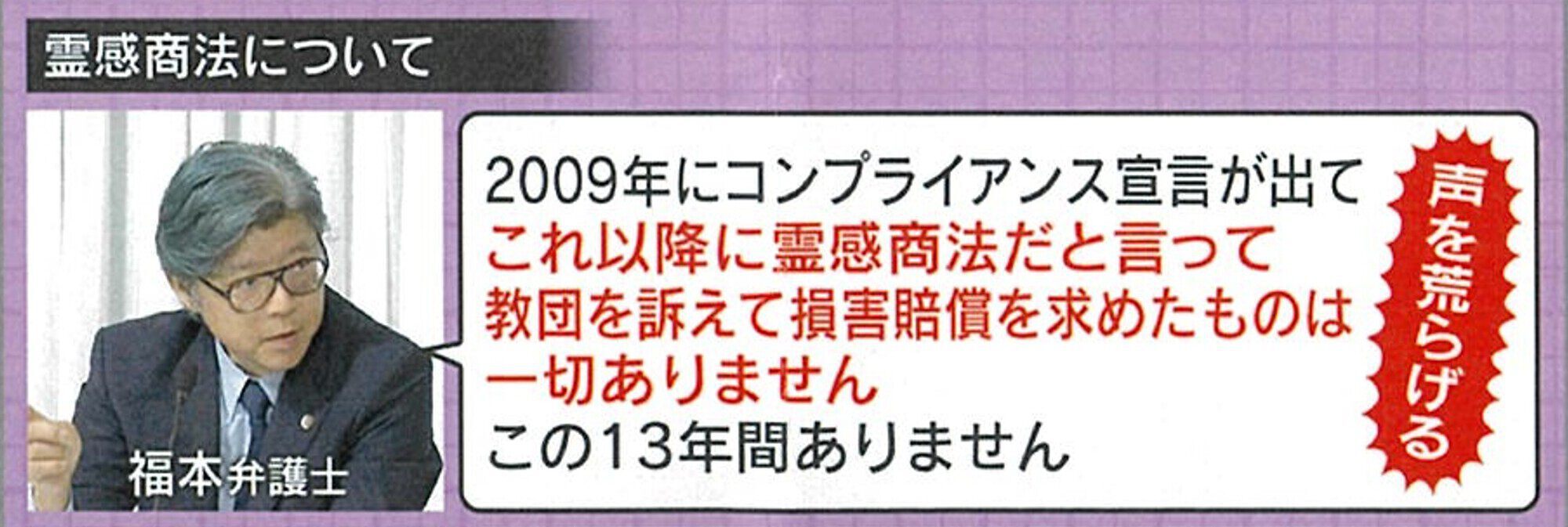 会見に同席した福本弁護士は、「2009年に『コンプライアンス宣言』を出して、信者が経営する会社における物販活動・開運商法については、一斉に無くなっています。これ以降に、霊感商法だといって“統一教会”を訴えて損害賠償を求めたものは、この13年間ありません」と説明しました。