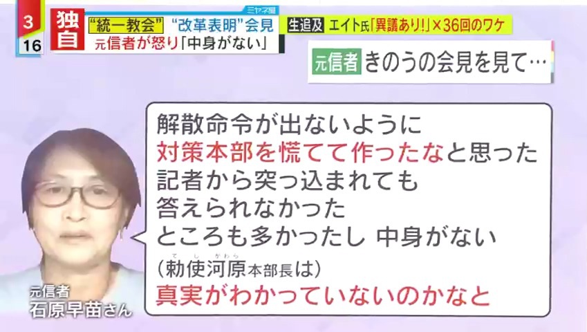 この会見を見た、元信者の石原早苗氏は「解散命令が出ないように、対策本部を慌てて作ったなと思った。記者から突っ込まれても答えられなかったところも多かったし、中身がない。勅使河原本部長は、真実が分かっていないのかなと感じた」とコメントしました。