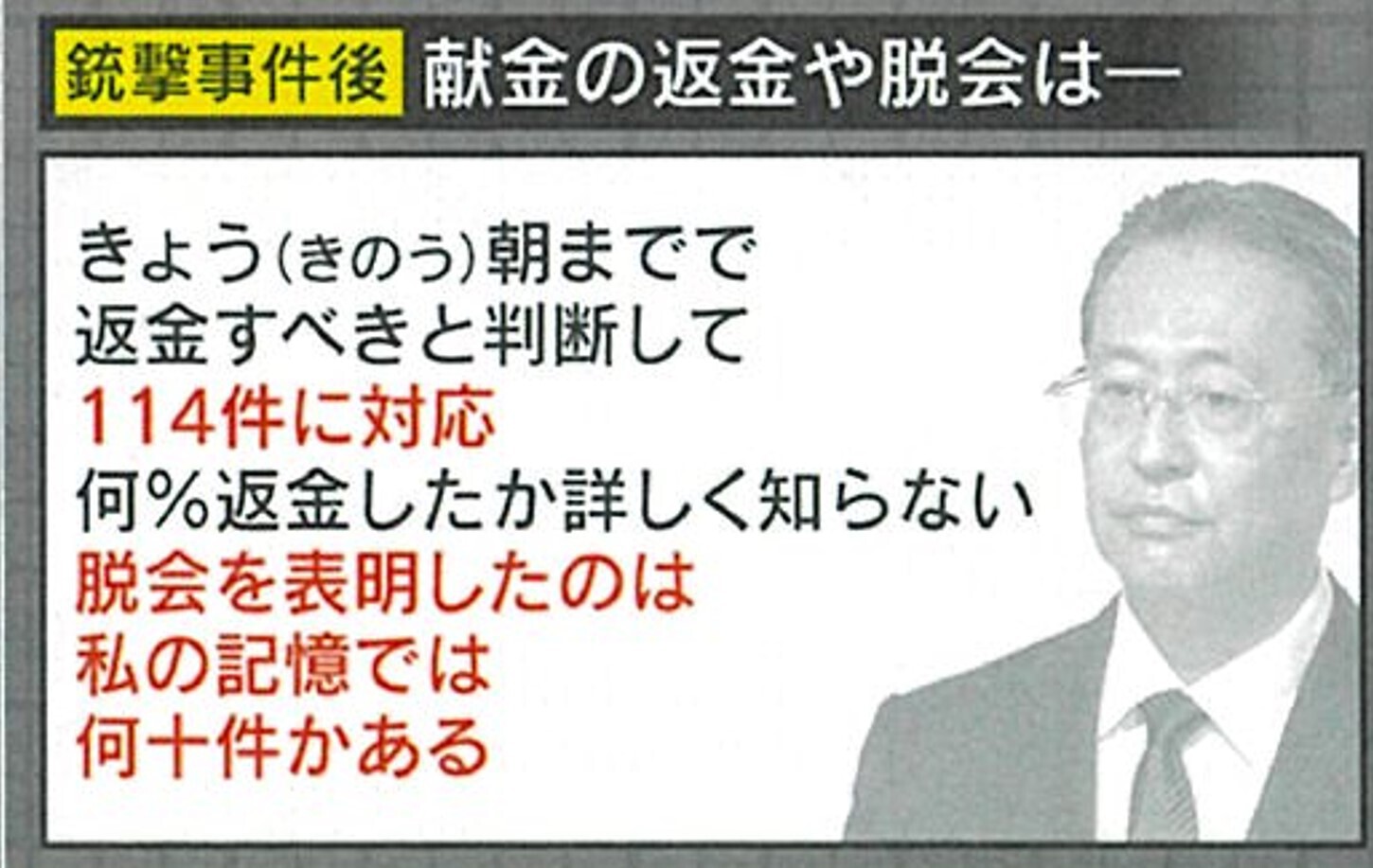 また、安倍元首相銃撃事件後の献金の返金や脱会について勅使河原氏は、「今日(会見の日)の朝までで、返金すべきと判断して114件に対応したが、何%返金したかは詳しく知らない。脱会を表明したのは、私の記憶では何十件かある」と話しました。