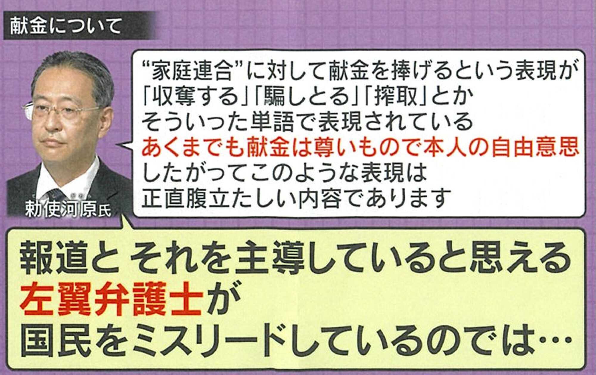 さらに勅使河原氏は「“家庭連合”に対する献金を『収奪する』『騙しとる』『搾取』と言った単語で表現されているが、あくまでも献金は“尊いもの”であって、本人の自由意志だ。このような表現は、腹立たしい内容だ。報道と、それを主導していると思える“左翼弁護士”が、国民をミスリードしているのでは…」と語りました。