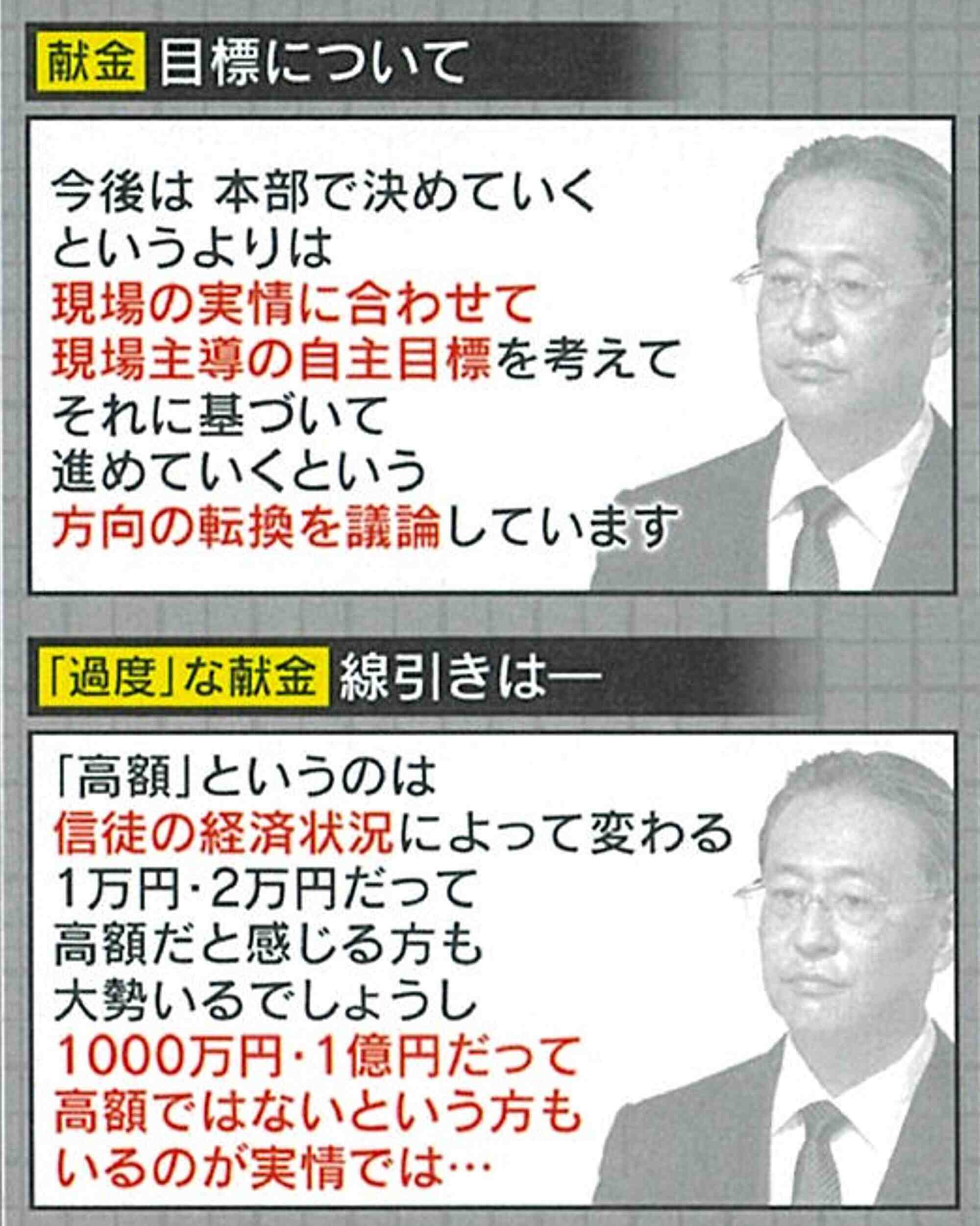 献金の目標について勅使河原氏は、「今後は本部で決めていくというよりは、現場の実情に合わせて、現場主導の自主目標を考えていくという、方向の転換を議論する」と言い、過度な献金の線引きについて「『高額』と言うのは、信徒の経済状況によって変わる。1万円・2万円だって高額だと感じる人も大勢いるでしょうし、1000万円・1億円だって高額でないという人もいるのが実情では…」と話しました。