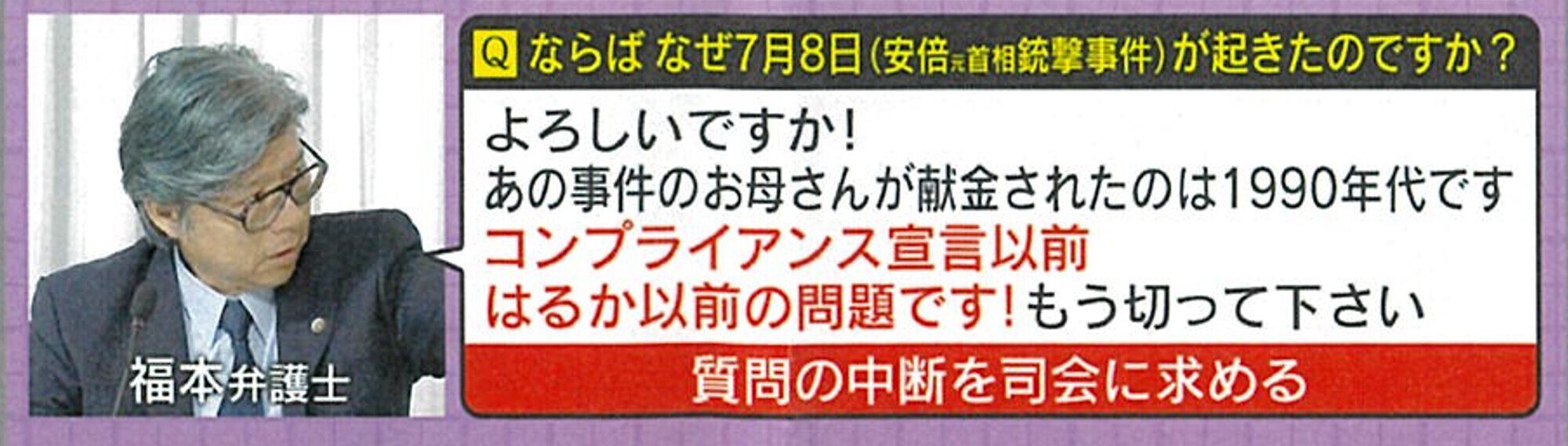 この後福本弁護士は、記者からの「なぜ安倍元首相銃撃事件が起きたのですか?」という質問に対し、「あの事件のお母さんが献金されたのは、1990年代です。それが20年以上を経て、それが山上容疑者の恨みとしてあのような形となったわけでありますけども、90年代の話であって、『コンプライアンス宣言』以前、はるか以前の問題です。もう切ってください!」と質問の中断を求める場面もありました。