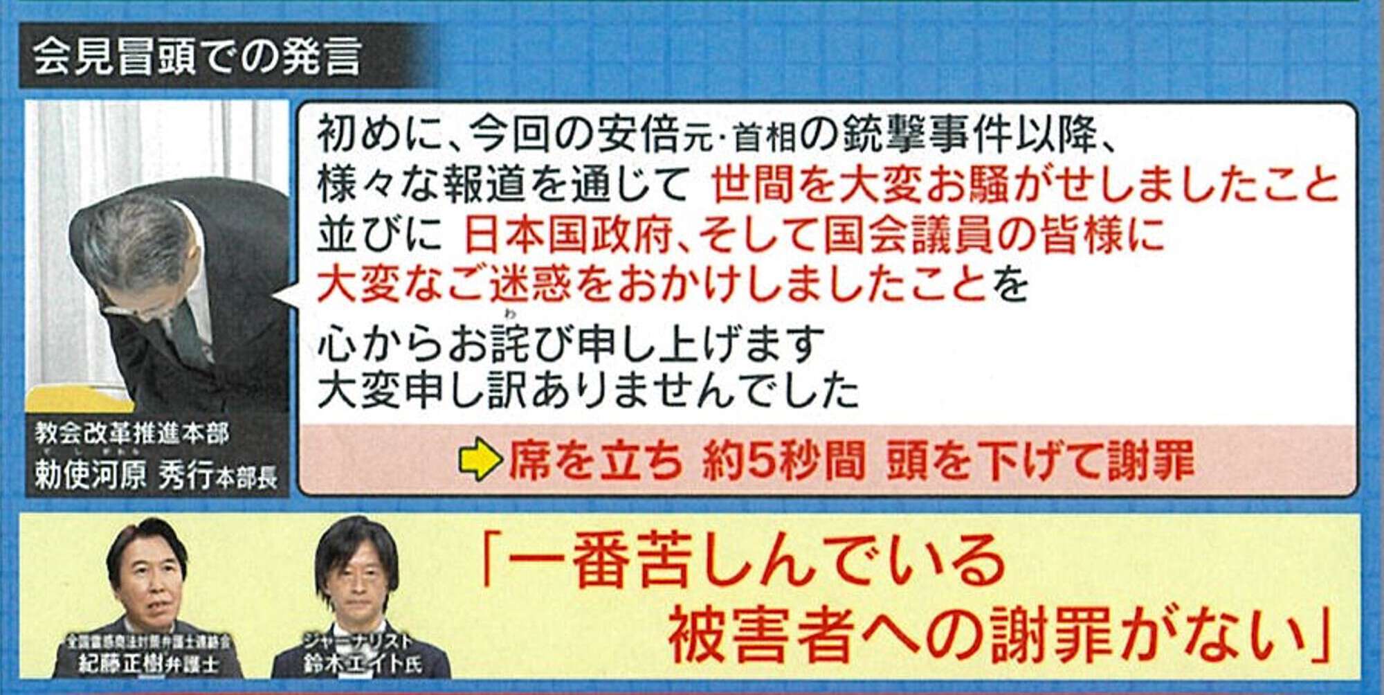 会見の冒頭、勅使河原氏は「安倍元首相の銃撃事件以降、様々な報道を通じて世間を大変お騒がせしましたこと、並びに日本国政府、そして国会議員の皆様に、大変なご迷惑をおかけしましたこと、心からお詫び申し上げます。大変申し訳ありませんでした」と述べ、「あくまでも個人的な思い」と前置きした上で、「山上容疑者の家庭連合に対する恨みが、今回の犯行の動機であると話していることを聞いて、私は大変胸が痛みました。また一連の報道を通して、日本国政府が調査に乗り出すという事態まで招いていること、そして、国会議員の先生方が一人一人、当法人との関係があったのかをメディアから詰問されるような事態を招いていることを、大変申し訳なく思っております」とコメントしました。