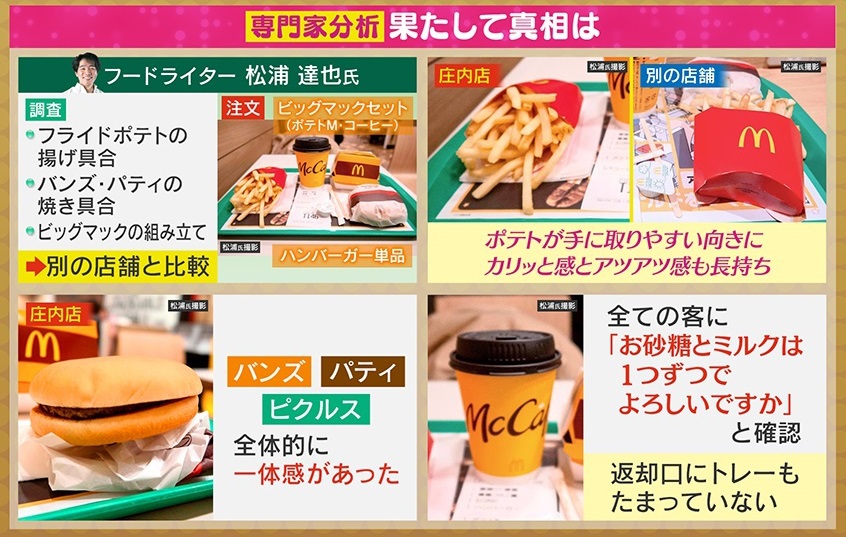また、フードライター・松浦達也氏も実際に庄内店へ行き、フライドポテトの揚げ具合・バンズやパティの焼き具合・ビッグマックの組み立てを、別の店舗と比較する調査を行ったといいます。