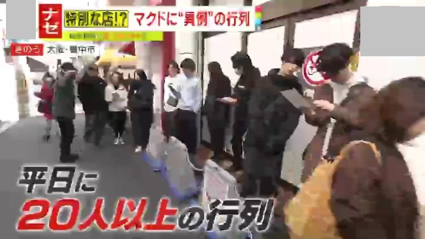 「ということで、噂は本当なのか、実際に、そのマクドナルドにやって来ました。一見、普通の店舗ですが…。あ、なんだか人だかりが…行列ができています!十数人はいらっしゃるでしょうか」