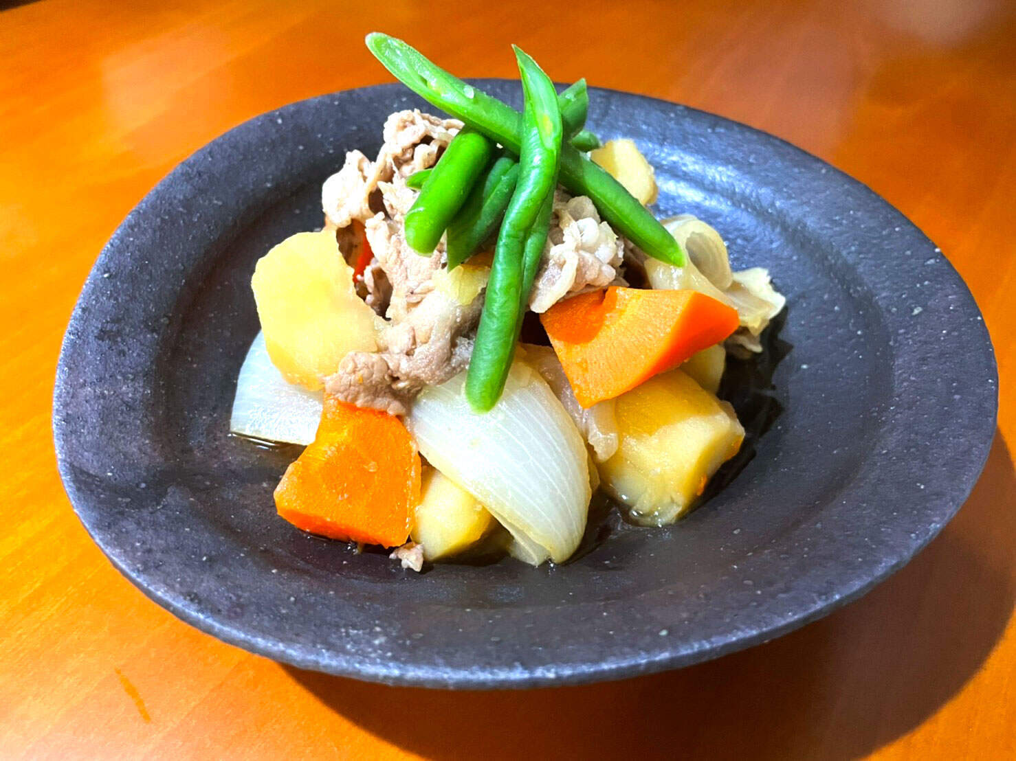 ⑤残った肉じゃがの汁気をザルでこしてからのせる