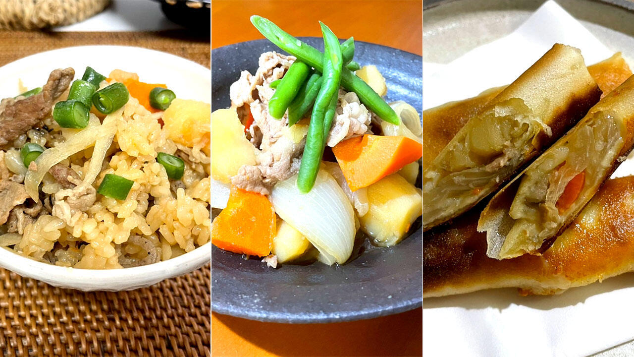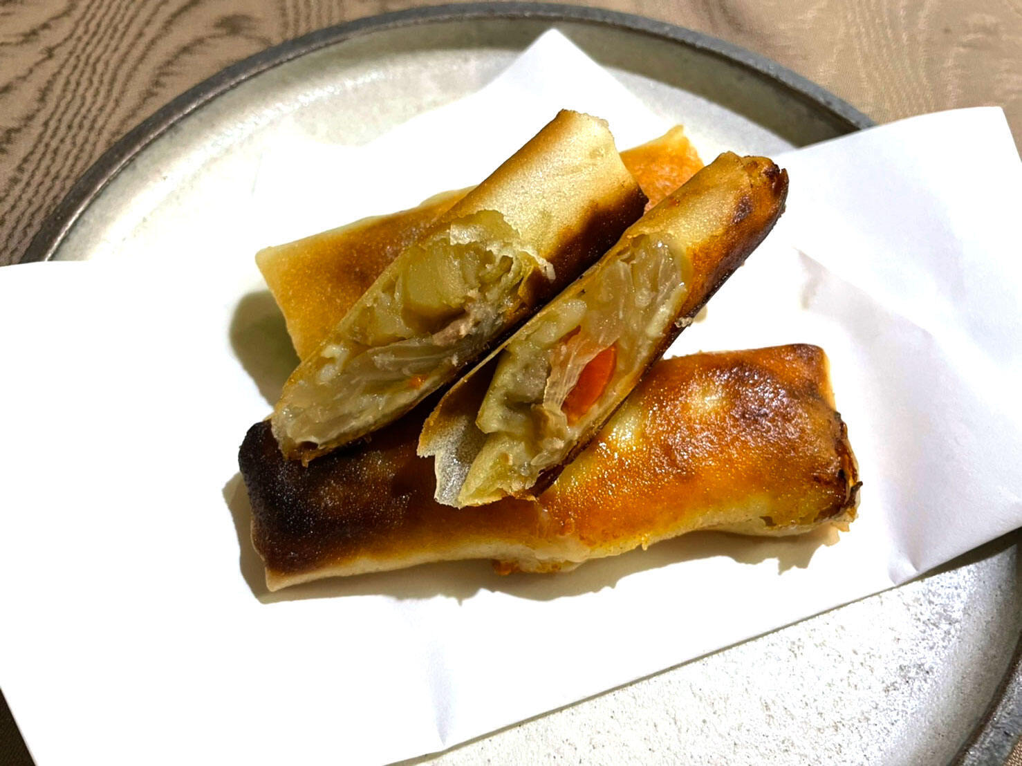 余った肉じゃがの水気をきってスライスチーズをのせ、春巻きの皮で巻く