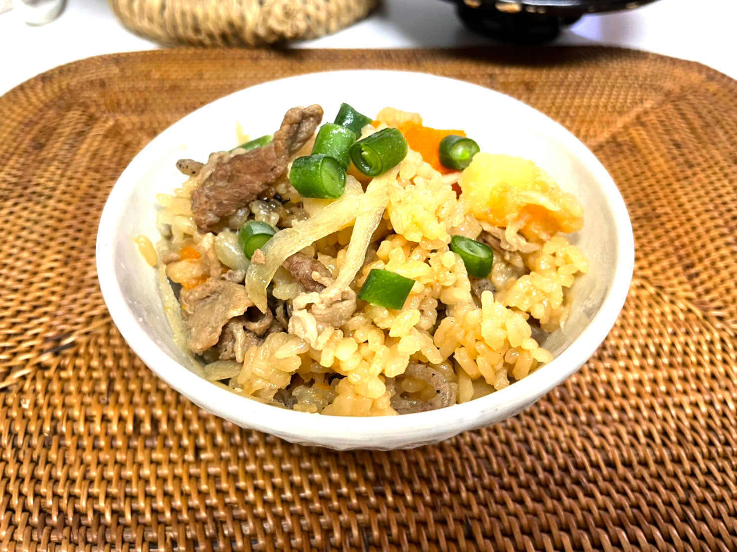 ③炊飯器に研いだ米と出汁、しょうゆ、酒を入れて軽く混ぜる