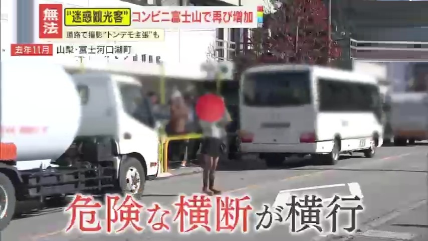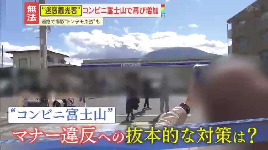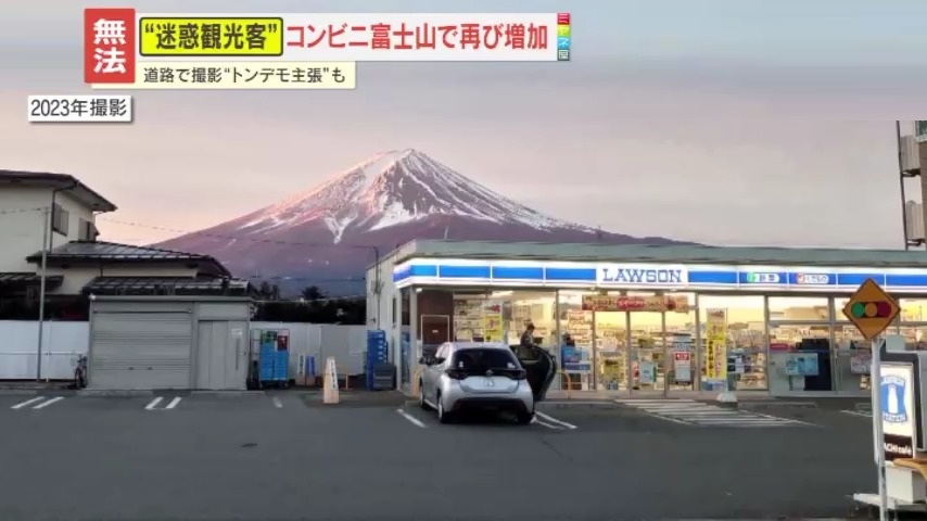 コンビニ越しに富士山が見られる、いわゆる“コンビニ富士山”です。2024年、この景色がSNSで話題となり、多くの外国人観光客が押し寄せました。しかし、危険な道路の横断やゴミのポイ捨てなど、外国人観光客によるマナー違反が大きな問題に。