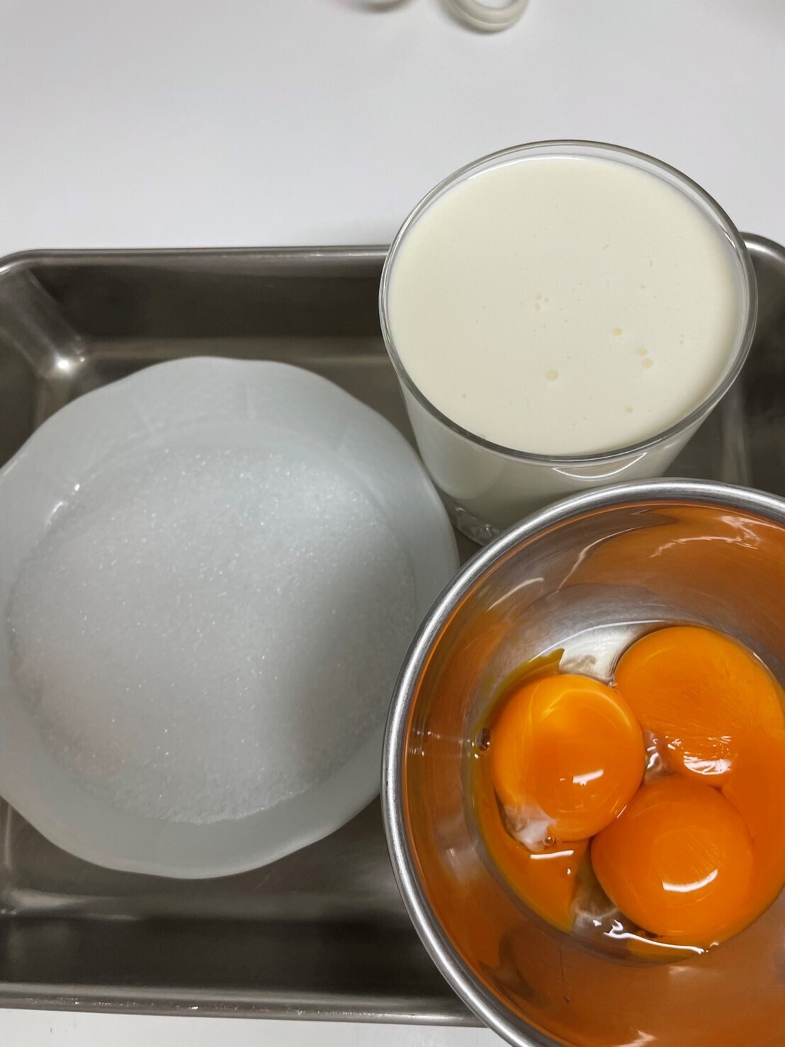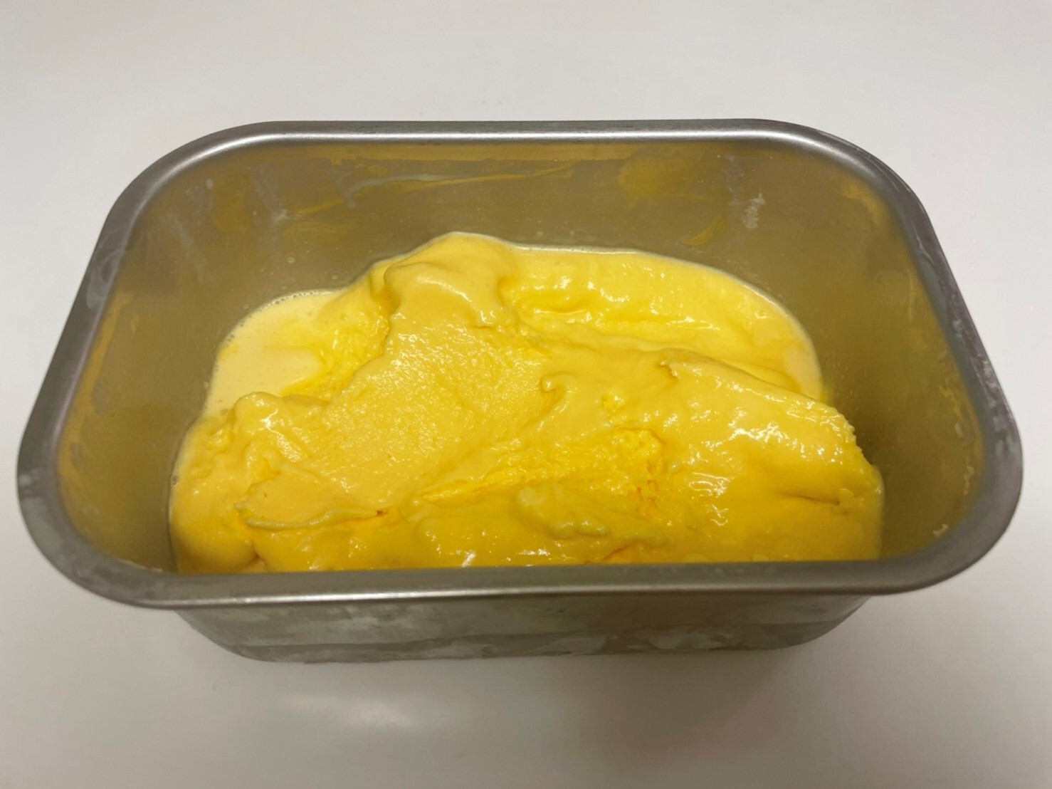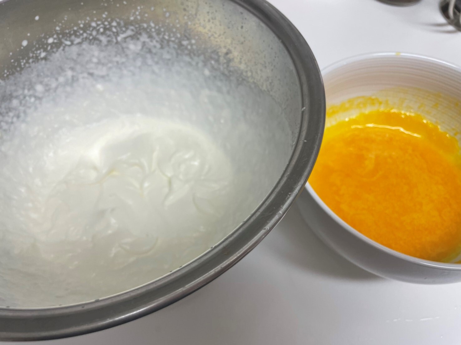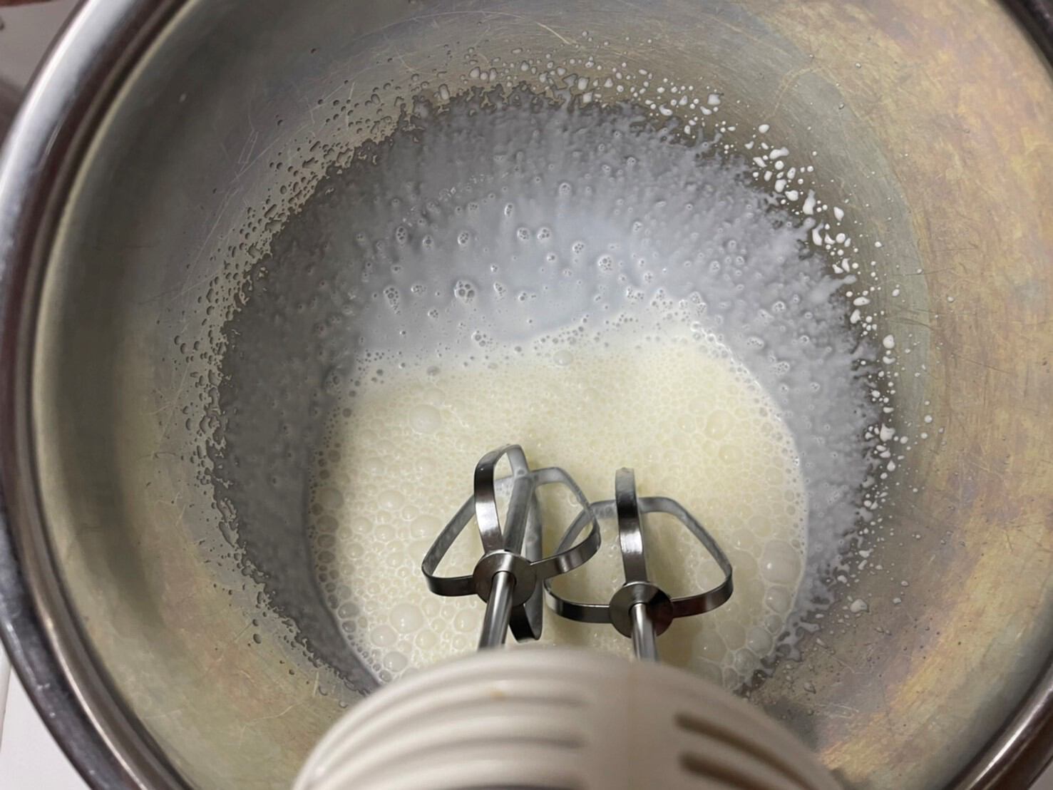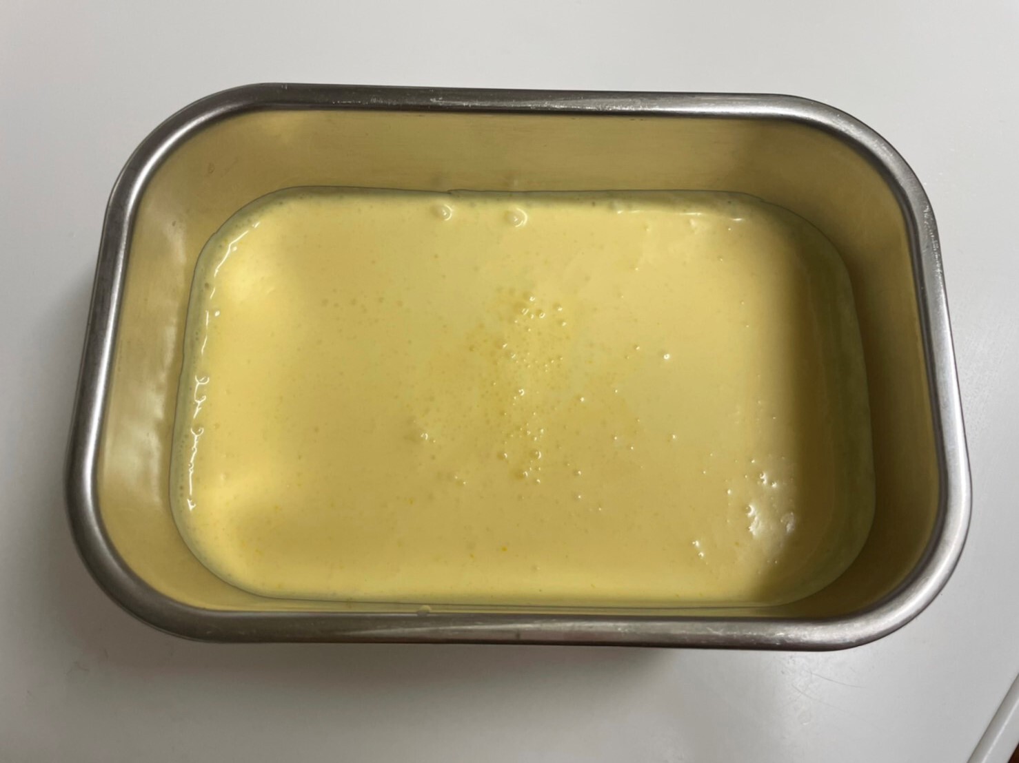 ⑤ ④に7分立てにした生クリームを2〜3回に分けて混ぜ合わせ、バニラエッセンスをくわえて、冷凍庫で冷やし固める