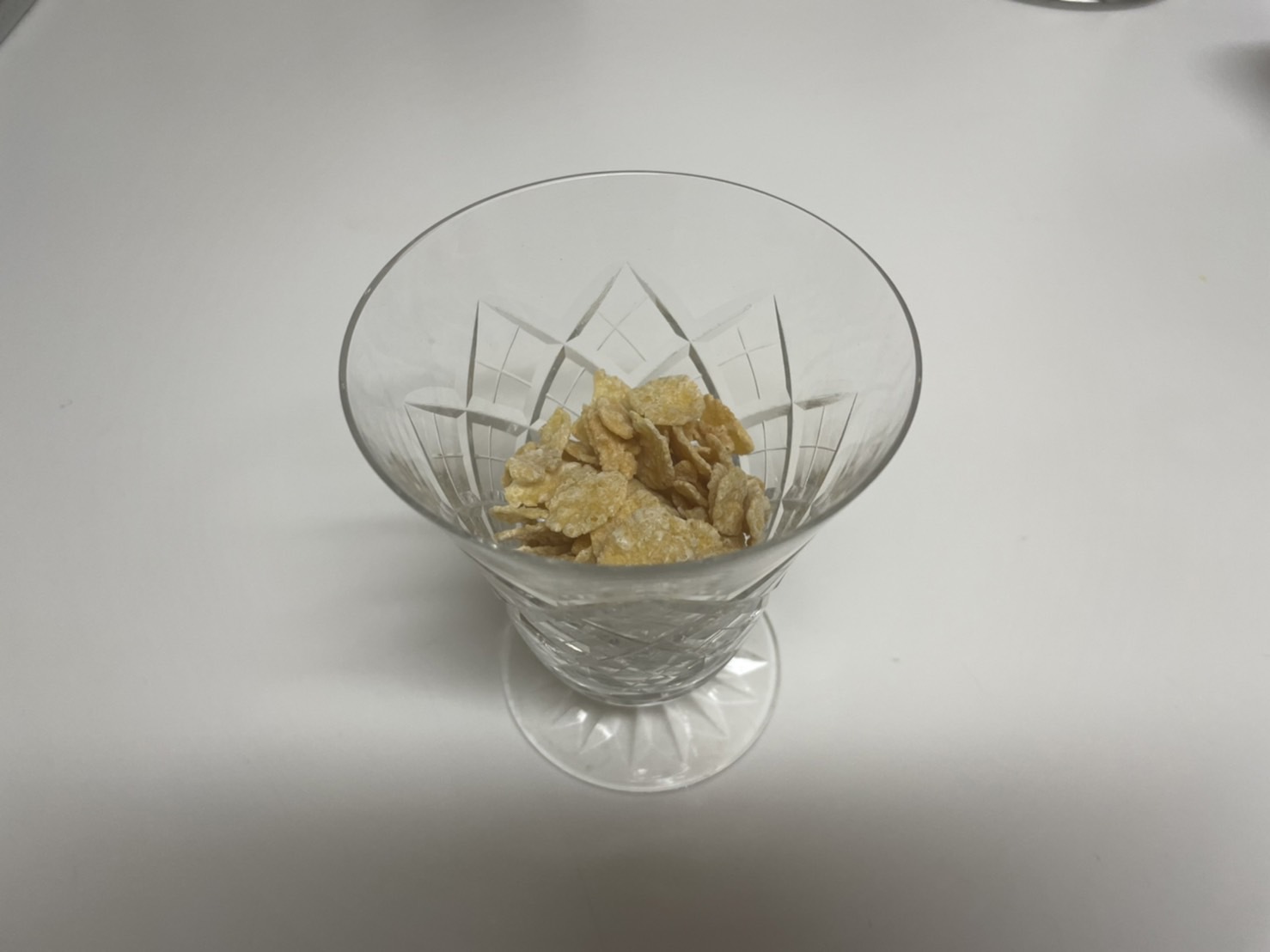 ⑥ グラスにコーンフレークを敷き、アイスクリーム、ラム酒につけたドライフルーツ、ナッツをトッピングし、出来上がり。