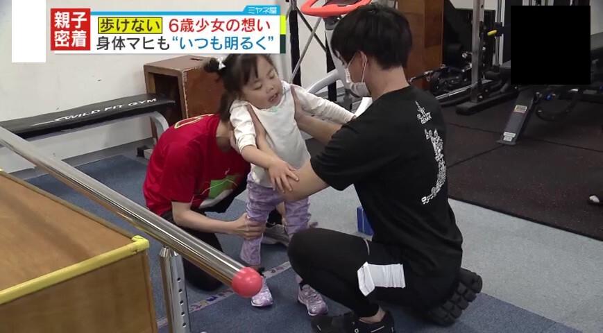 理央奈ちゃんは月に1度、車で4時間かけて、大阪のリハビリ施設に通っています。ほぼ休むことなく3時間に及ぶトレーニングですが、理央奈ちゃんは弱音を吐かず、時には笑顔を見せながら、一生懸命トレーナーの指示を実行します。