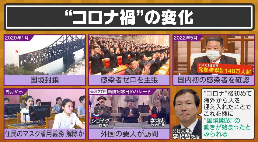 北朝鮮は、2020年の1月に他国と比べて早い段階で国境封鎖を行いました。その後しばらくは国内の感染者ゼロを主張し、大人数が集まる“密”な状態でも誰もマスクをしていませんでした。しかし2022年5月、国内初の感染者を確認。金総書記も異例のマスク姿を見せていましたが、およそ1週間後には、発熱者の累計が148万人を超えるという報道がありました。そして、ことし7月になって住民のマスク着用義務が解除されたのか、ノーマスクの映像が公開されました。また、7月27日の戦勝記念のパレードには、ロシアと中国からショイグ国防相、李政治局員など要人が平壌を訪問しています。李教授によると「コロナ後初めての海外から人を受け入れたことで、これを機に“国境開放”の動きが始まったとみられる」ということです。