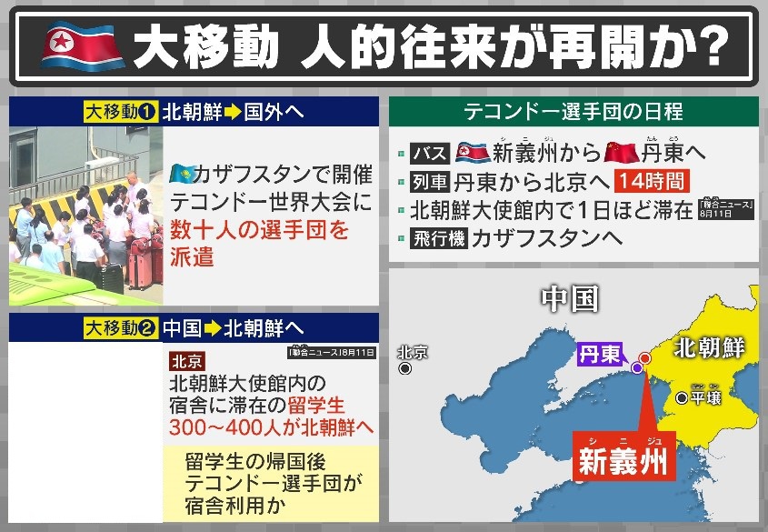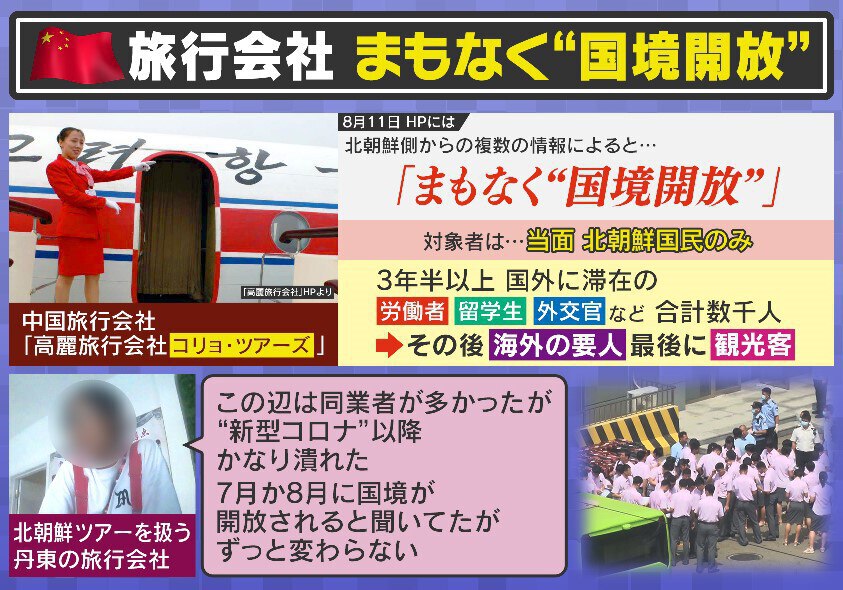 8月11日中国の旅行会社コリョ・ツアーズはホームページに、北朝鮮からの情報として「まもなく“国境開放”する」と伝えました。対象者は「当面北朝鮮国民のみ」で、国境封鎖から3年半以上国外に滞在している労働者・留学生・外交官など数千人が帰国できるということです。その後に、海外の要人、最後に観光客になるということです。北朝鮮ツアーを扱う丹東の旅行会社は「この辺は同業者が多かったが“新型コロナ”以降かなり潰れた。7月か8月に国境が開放されると聞いていたが、今のところ変わらない」と話しています。