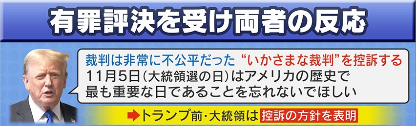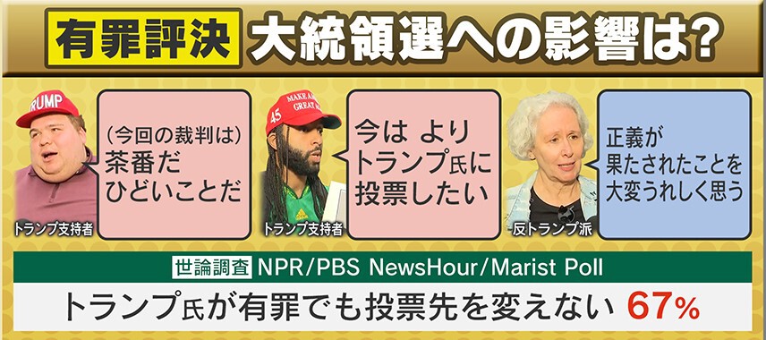 今回の有罪評決の大統領選への影響ですが、トランプ支持者からは「(今回の裁判は)茶番だ。ひどいことだ」「今はよりトランプ氏に投票したい」などの声が上がっています。一方、反トランプ派は「正義が果たされたことを大変うれしく思う」と話しています。世論調査によると「トランプ氏が有罪でも投票先を変えない」という答えが67%ありました。