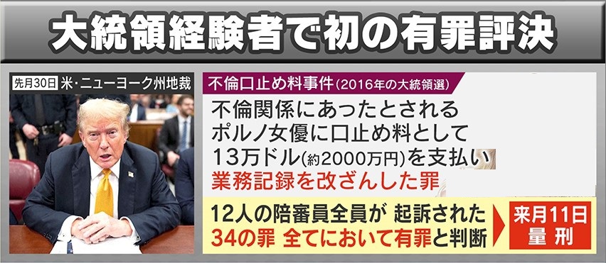 トランプ前・大統領は、不倫関係にあったとされるポルノ女優に口止め料として13万ドル(約2000万円)を支払い、業務記録を改ざんした罪などで起訴され、12人の陪審員全員が34の罪全てにおいて有罪と判断しました。7月11日に量刑が言い渡されるということです。