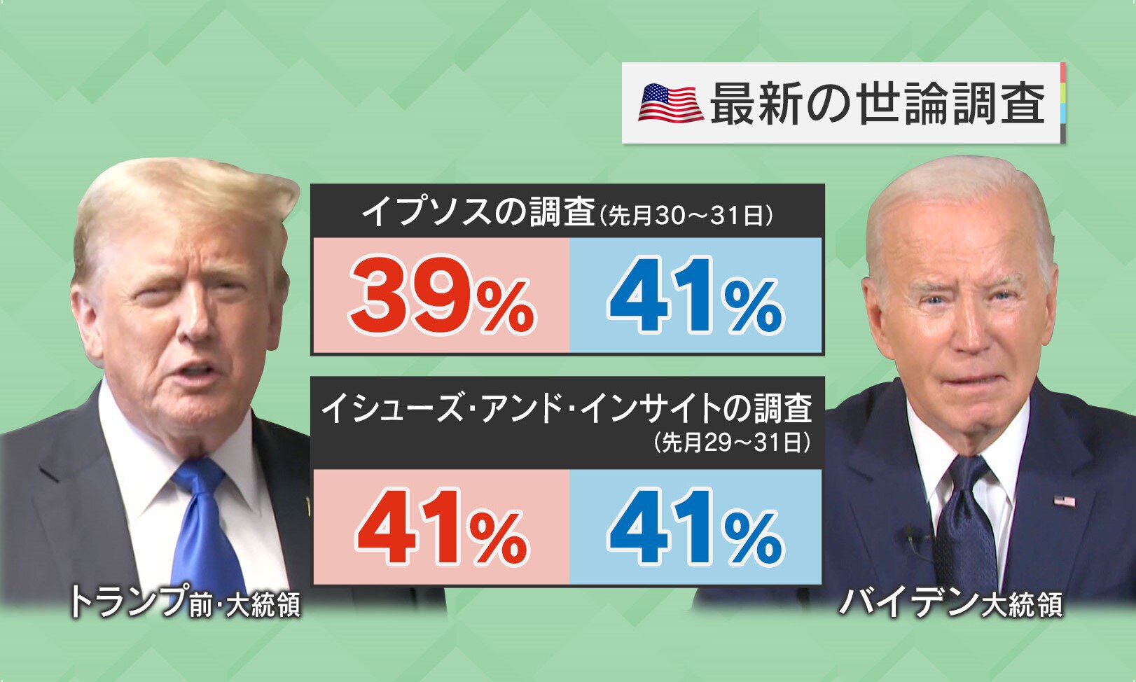 最新の世論調査によると、トランプ前・大統領とバイデン大統領の支持率はともに4割と拮抗しています。