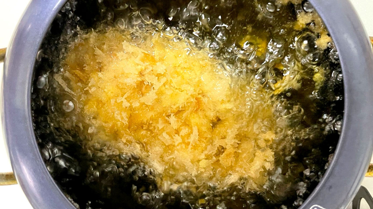 ④ 170°から180°の油で揚げ、狐色になったら引き揚げる。