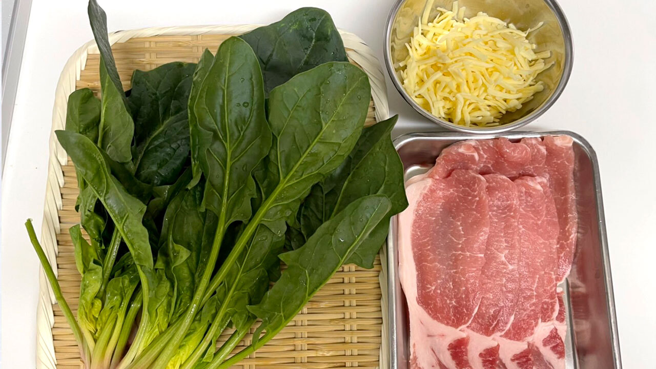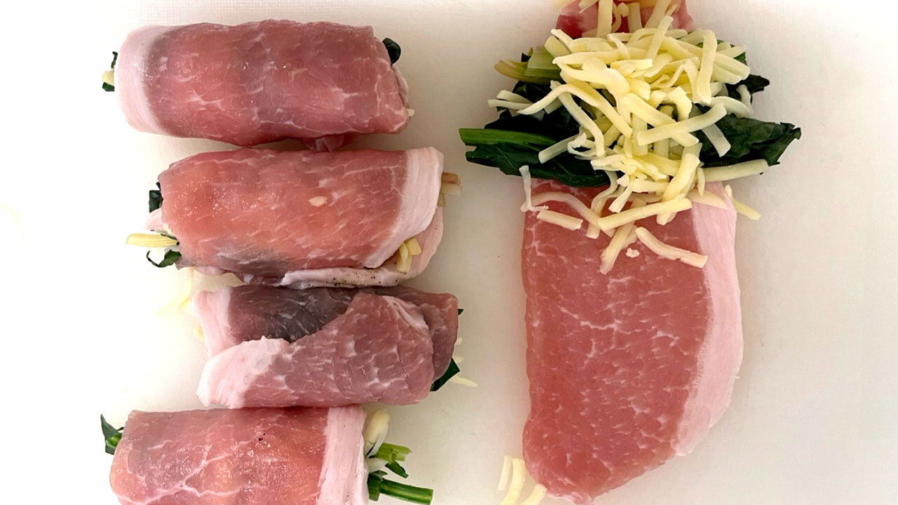 ② ロース肉を広げて軽く塩胡椒し、ほうれん草、料理用チーズを乗せてクルクルと巻く。