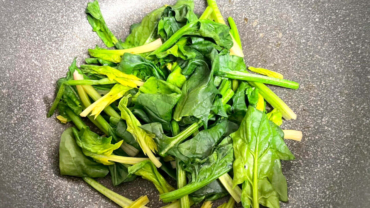 ① ほうれん草を7〜8センチにカットし、フライパンでさっと火を通ししんなりさせておく