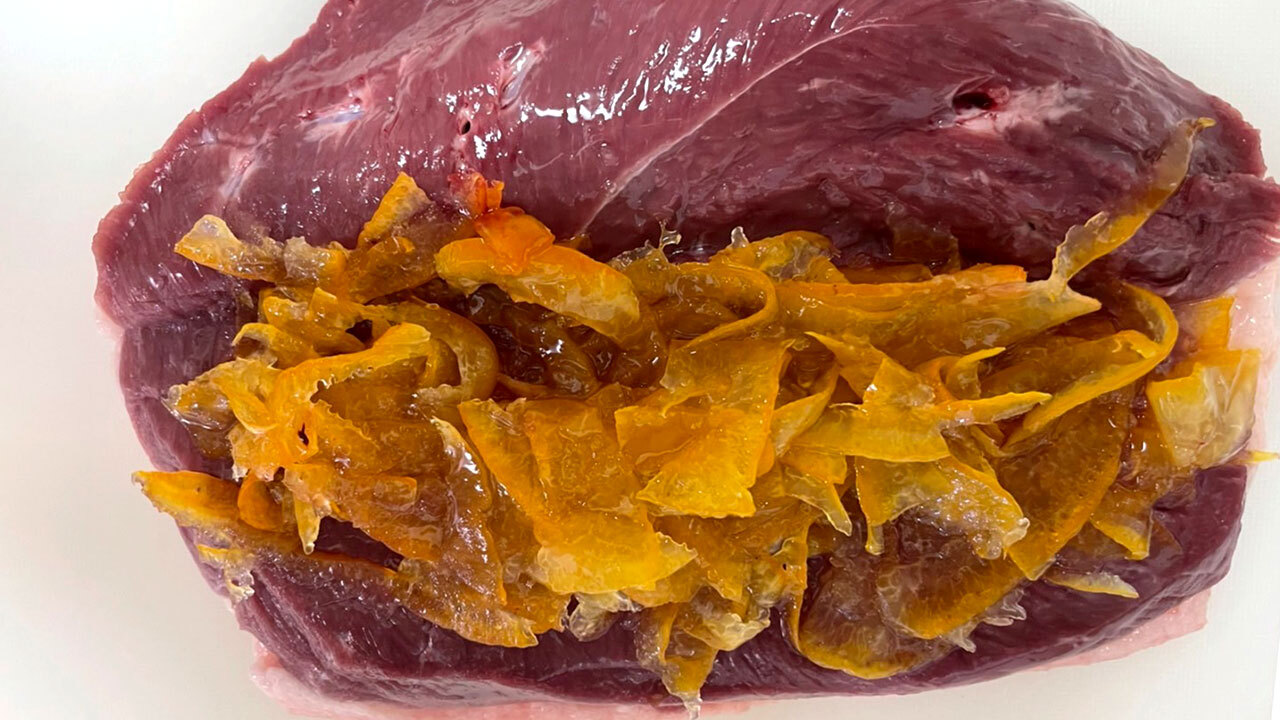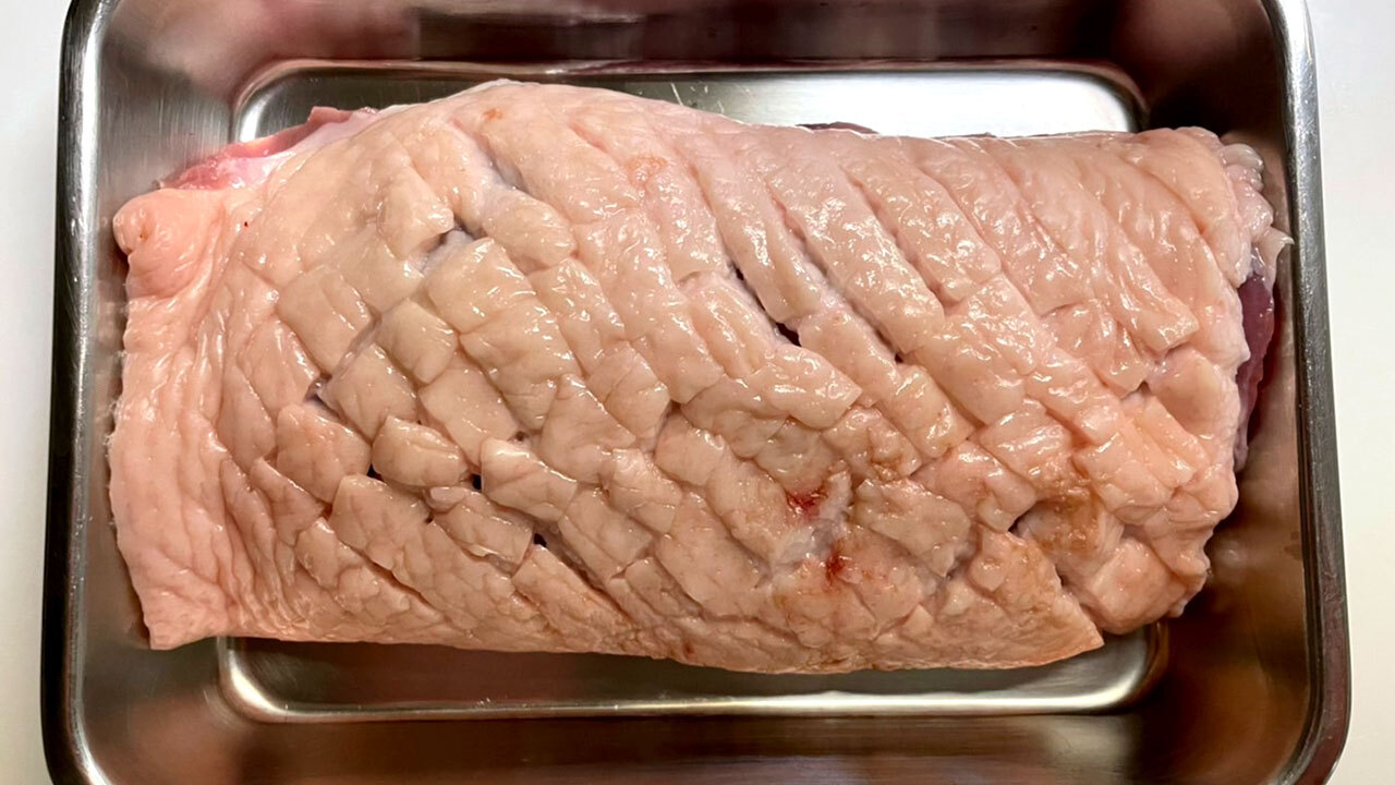 ①合鴨の脂身部分に1cm感覚で斜めに切り込みを入れる