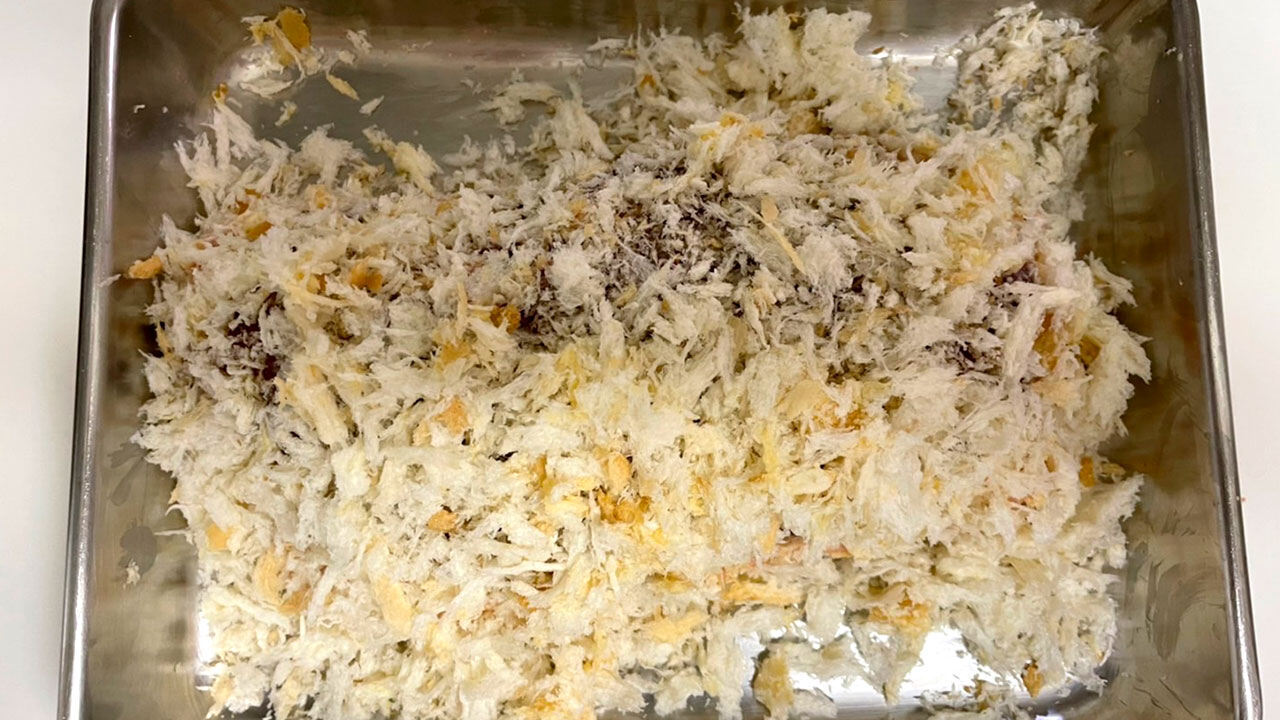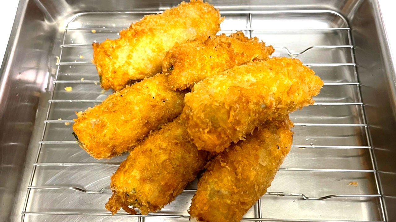 ⑤バッター液に漬け、両面にパン粉をつけて150度の油でゆっくりと15分~20分程揚げる