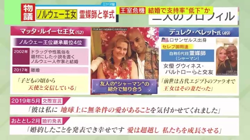 2024年8月31日、ノルウェー王室のマッタ・ルイーセ王女と米・ロサンゼルス出身の自称霊媒師(シャーマン)デュレク・ベレット氏が、ついに結婚。しかし、次々に批判が殺到し、まるで“お騒がせ”ヘンリー王子夫妻のようで…。王室ジャーナリスト・多賀幹子さんの解説です。
