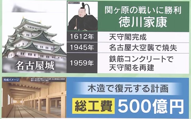 名古屋城は、1612年に徳川家康によって建てられ、1945年の名古屋大空襲で焼失。その後、1959年に天守閣が鉄筋コンクリートで再建されました。江戸時代初期に建てられた当時の資料が多数現存する数少ない城の一つで、市は「城を忠実に復元するため、現在設置されているエレベーターを設けない方針」だと発表しました。