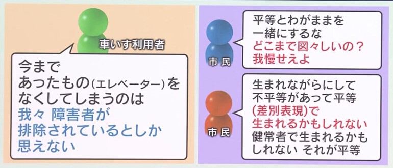 この方針に、車いす利用者らは猛反発。エレベーター設置の可否を問う市民討論会では、車いす利用者らと、エレベーター設置に反対する参加者らとが対立し、大論争が勃発しました。