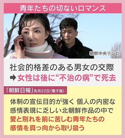 そんな中での“異例のドラマ”放送の理由について、2025年7月27日の『ウォール・ストリート・ジャーナル(電子版)』は、「脱北者によると『従来のプロパガンダ(政治宣伝)番組は現実離れして敬遠されている』ということで、ロマンス関連の演出を強化したのではないか」としています。