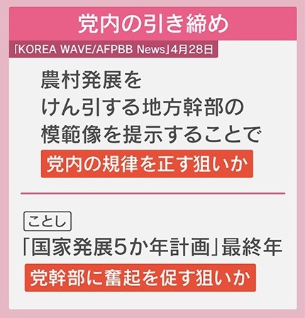 また、党内の引き締めもあるのでは、という分析もされています。2025年4月28日の『KOREA WAVE/AFPBB News』によると、農村発展をけん引する地方幹部の模範像を提示することで、党内の規律を正す狙いがあるといいます。また今年は、『国家発展5か年計画』の最終年ということで、党幹部に奮起を促す狙いもあるのではないかということです。