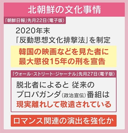 北朝鮮の文化事情ですが、7月22日の『朝鮮日報』によると、2020年に韓国の映画などを見た者に、最大で懲役15年の刑を宣告するという『反動思想文化排撃法』を制定しています。