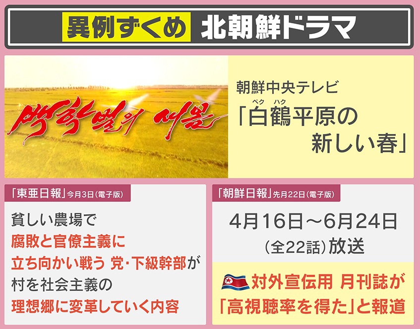 朝鮮では『白鶴(ペクハク平原の新しい春』というドラマが『朝鮮中央テレビ』で放送されました。2025年8月3日の『東亜日報(電子版)』によると、あらすじは貧しい農場で、腐敗と官僚主義に立ち向かい戦う、党・下級幹部が、村を社会主義の理想郷に変革していく内容で、『朝鮮日報』によると、2025年4月16日~6月24日の間に22話放送されたということです。そして、北朝鮮対外宣伝用月刊誌が「高視聴率を得た」と報道したということです。