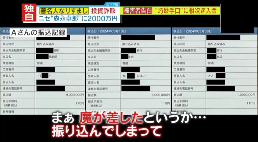 Aさんは、こちらも信じて投資した結果、“偽・森永氏”と同様の手口で30万円が奪われてしまいました。被害が発覚後は警察に相談し、被害届を出したということです。