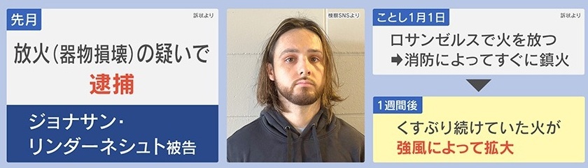 そして10月、衝撃の展開が明らかになりました。放火(器物損壊)の疑いで逮捕されたジョナサン・リンダーネシュト被告は、1月1日、ロサンゼルスで火を放ちました。その時は消防によってすぐに鎮火されましたが、1週間後、くすぶり続けていた火が強風によって拡大したということです。
