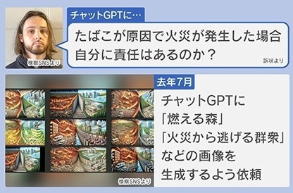また、訴状によると、チャットGPTに「たばこが原因で火災が発生した場合、自分に責任はあるのか?」と質問し、2024年7月には、チャットGPTに「燃える森」「火災から逃げる群衆」などの画像を生成するよう依頼していたということです。