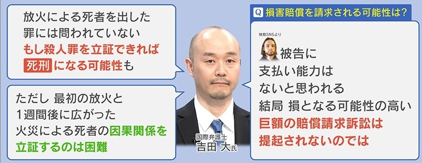 国際弁護士・吉田大氏によると、「放火による死者を出した罪には問われていない。もし殺人罪を立証できれば死刑になる可能性もある」といいますが、「最初の放火と1週間後に広がった火災による死者の因果関係を立証するのは困難」ということです。また、損害賠償を請求される可能性について吉田氏は、「被告に支払い能力はないと思われる。結局、損となる可能性の高い巨額の賠償請求訴訟は、提起されないのでは」と話しています。