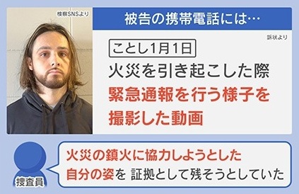 被告の携帯電話には、1月1日に火災を引き起こした際、緊急通報を行う様子を撮影した動画が残っていました。捜査員によると、「火災の鎮火に協力しようとした自分の姿を証拠として残そうとしていた」ということです。