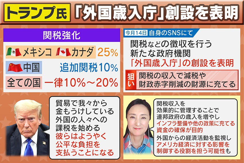 そしてトランプ氏が就任時から話している関税強化ですが、メキシコ・カナダには25%、中国には追加関税で10%、そして全ての国で一律10%から20%の関税になるといいます。
