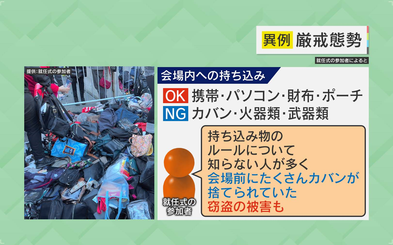 会場への持ち込みも厳しく制限されていて、持ち込みが許されていたのは『携帯』『パソコン』『財布』『ポーチ』などで、持ち込めないのは『カバン』『火器類』『武器類』でした。就任式の参加者によると「持ち込みのルールについて知らない人が多く、会場前にたくさんのカバンが捨てられていた。窃盗の被害も」と話しています。