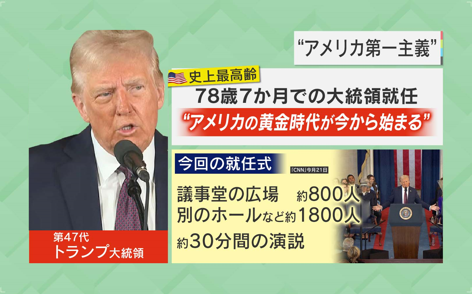 「異例です。アメリカ国内で、アメリカ国民と一緒に大統領就任を祝う式典ですから、外交のツールではないわけです。しかし今回は、外交の色彩も入れつつ、ある意味で招待客ということです。トランプ氏が宣誓式をする後ろに大手企業のCEOたちが並ぶというのは、私は見たことがないです」