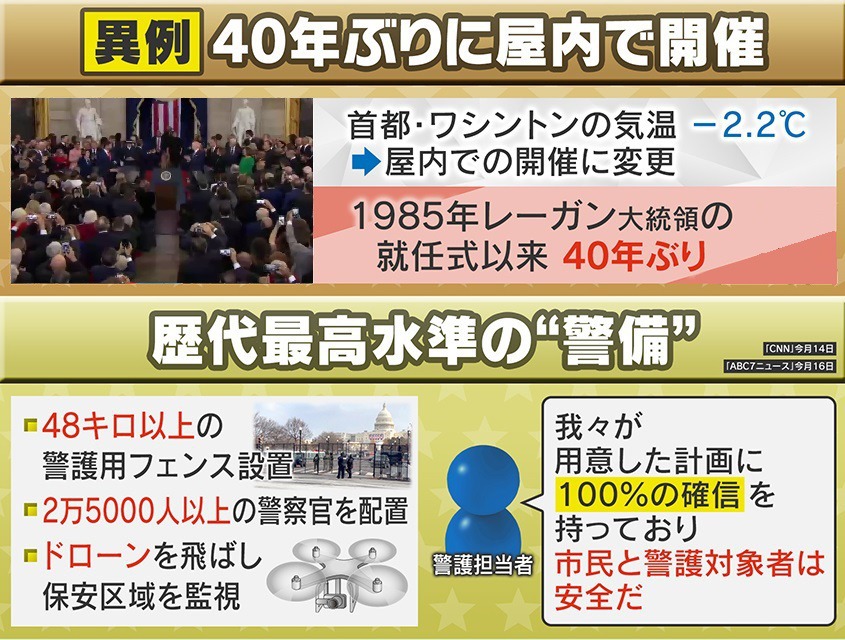 歴代最高水準の“警備”となり、48キロ以上の警護用フェンスが設置され、2万5000人以上の警察官を配置。ドローンを飛ばし、保安区域を監視していました。警護担当者によると「我々が用意した計画に100%の確信を持っており、市民と警護対象者は安全だ」と話しています。