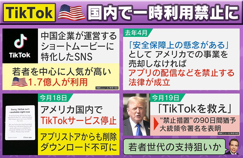 アメリカ国内で一時利用停止になっているTikTokですが、TikTokというと中国企業が運営するショートムービーに特化したSNSで、若者を中心に人気が高く、アメリカでは1億7000万人が利用しています。TikTokを巡っては、2024年4月に「安全保障上の懸念がある」としてアメリカでの事業を売却しなければアプリの配信などを禁止する法律が成立していました。