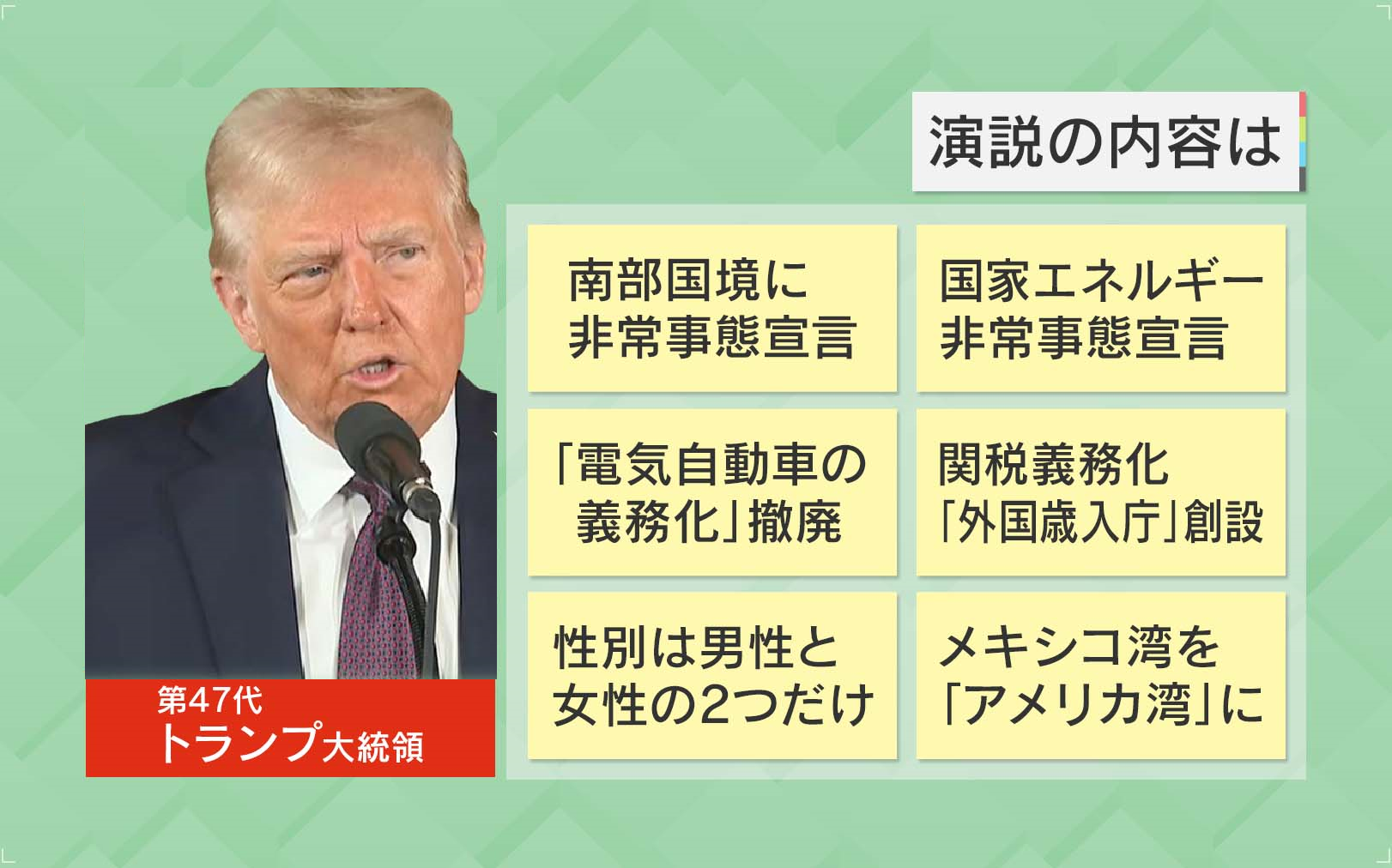 そしてトランプ氏の演説内容は、『南部国境に非常事態宣言』『国家エネルギー非常事態宣言』『“電気自動車の義務化”撤廃』『関税義務化“外国歳入庁”創設』『性別は男性と女性の2つだけ』『メキシコ湾を“アメリカ湾”に』というものでした。